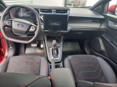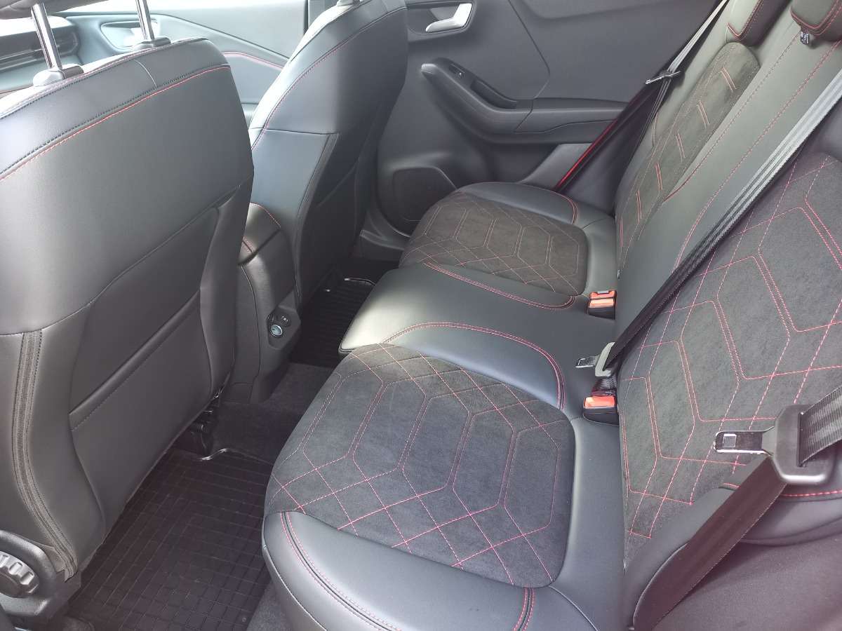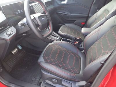 Przednie fotele – z tapicerką Neosuede/Vinyl z elementami skóry ekologicznej w ciemnej tonacji, z przeszyciami w kolorze czerwonym, styl sportowy